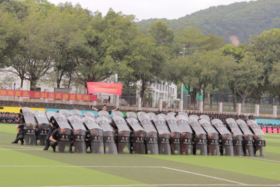 典礼在雄壮的国歌声中拉开帷幕。伴随着激昂的口号,2025级新生组成的方阵迈着有力的步伐,依次通过主席台接受检阅。在警务技能汇报表演中,擒敌拳、警棍盾牌术、大型防暴处突演练及数字步操等项目轮番上演,新生老生协同配合,动作规范、战术娴熟,赢得了在场领导嘉宾和师生的阵阵掌声。
