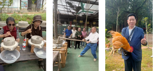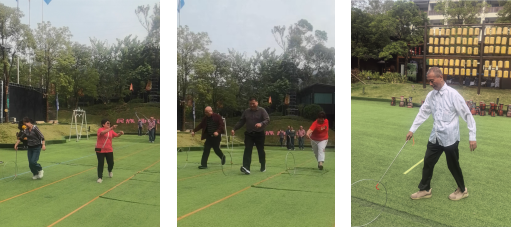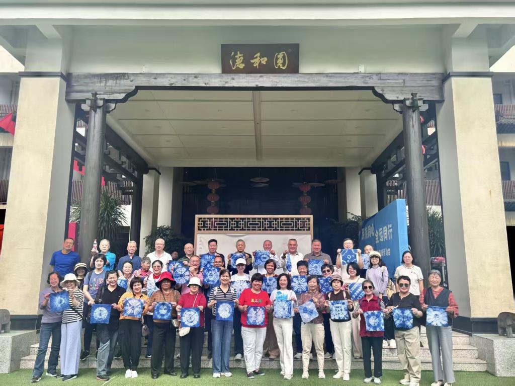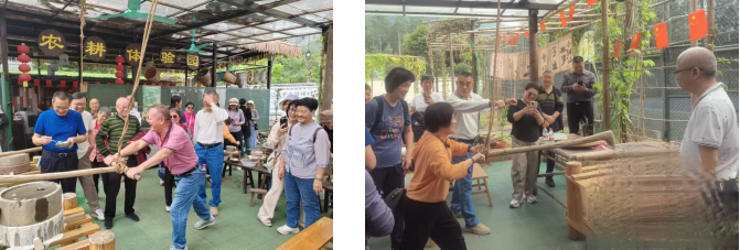 在活动现场,壮族竹竿舞率先点燃气氛。欢快民歌中竹竿开合作响,老同志们踊跃参与跳跃,生疏动作与灿烂笑容相映,现场掌声不断。岁岁重阳,童心不老,滚铁环环节勾起童年回忆。老同志们有的技艺娴熟推动铁环灵活转弯,有的手生屡试不气馁,大家直呼找回儿时快乐。在工艺师指导下,老同志们亲手折布、捆布,制作出自己的扎染作品,感受传统工艺的乐趣。古朴的大磨旁,老同志们分工协作,有的推动沉重的磨盘,有的添豆加水,配合默契。在趣味抓鸡环节,老同志们摩拳擦掌,或迂回靠近或默契配合,成功“擒获”土鸡,现场笑声不断,将活动推向高潮。