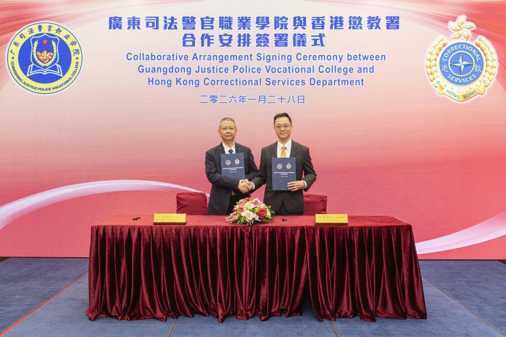 1月28日,彭钧华代表学院与香港特别行政区政府惩教署署长黄国兴在香港惩教学院签署合作安排。本次签约标志着双方就去年在粤港澳惩教培训工作座谈会上所达成的合作意向转化落实,推动双方在交流互访、课程培训、专业研究及专题研讨等多个方面开展实质性合作。下一步,学院还将与澳门惩教管理局、澳门保安部队高等学校签署相关合作安排,助力粤港澳惩教培训迈向新里程。