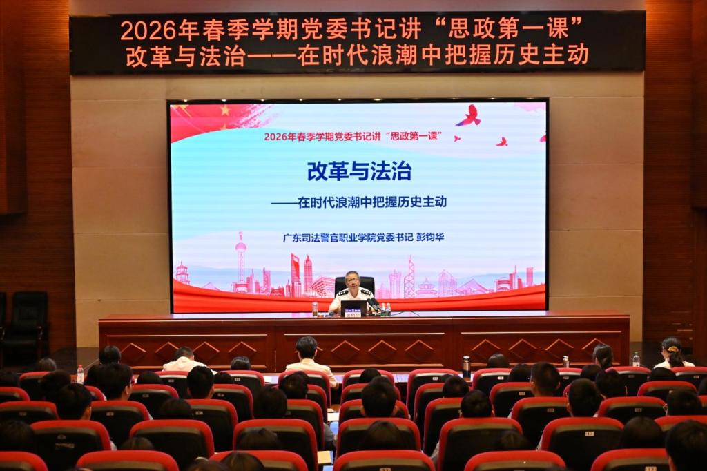 为深入贯彻落实新时代法治建设与全面深化改革要求,筑牢青年学子思想根基,强化思想政治引领,4月10日下午,学院党委书记彭钧华以《改革与法治——在时代浪潮中把握历史主动》为题,在龙洞校区行政楼学术报告厅开讲春季学期“思政第一课”。学院思想政治理论课教学部教师代表、各系部学生代表齐聚一堂,共同聆听这场兼具历史厚度、理论深度与现实温度的思政大课。