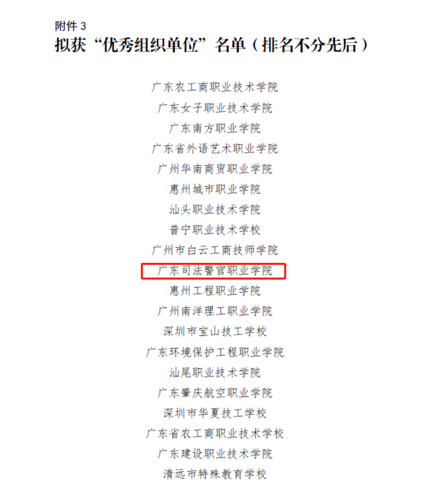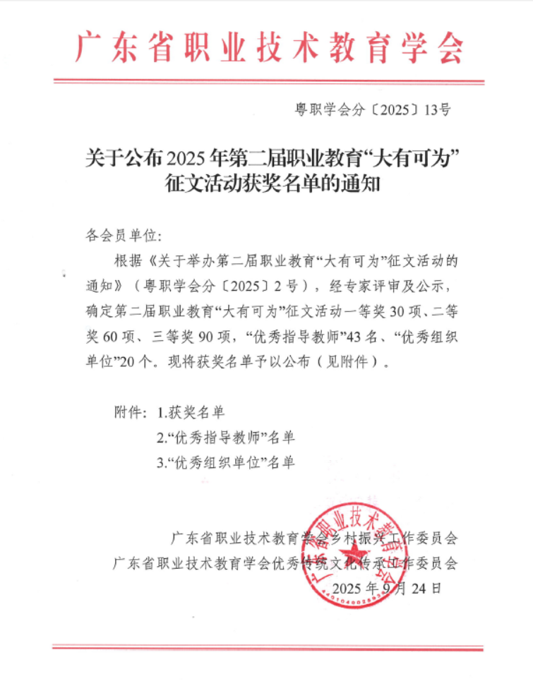 近日,广东省职业技术教育学会发布《关于公布2025年第二届职业教育“大有可为”征文活动获奖名单的通知》(粤职学会分〔2025〕13号),学院再创佳绩,荣获多项荣誉。学院教师赵倩荣获一等奖,蔡荣锴荣获三等奖,龙仕旻入选“优秀指导教师”名单,安全保卫系2023级学生肖湘荣获三等奖,学院荣获征文活动的“优秀组织单位”称号。