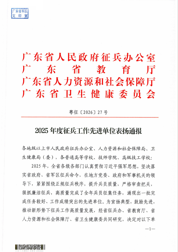 近日,广东省人民政府征兵办公室、省教育厅联合发布2025年度征兵工作先进单位表扬通报,学院再次榜上有名,是自2023年以来,连续第三年获此项省级殊荣。通过构建实施国防教育、兵员征集和“精准育苗”工作的稳定、高效、高质量长效机制,学院育人成果显著,国防贡献持续彰显。