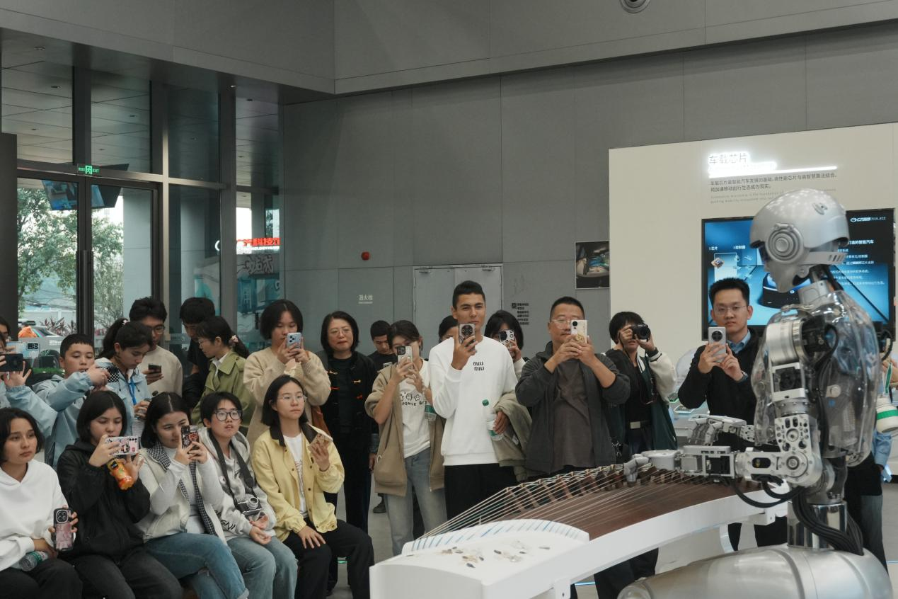 图为师生用手机拍摄机器人弹钢琴的场景