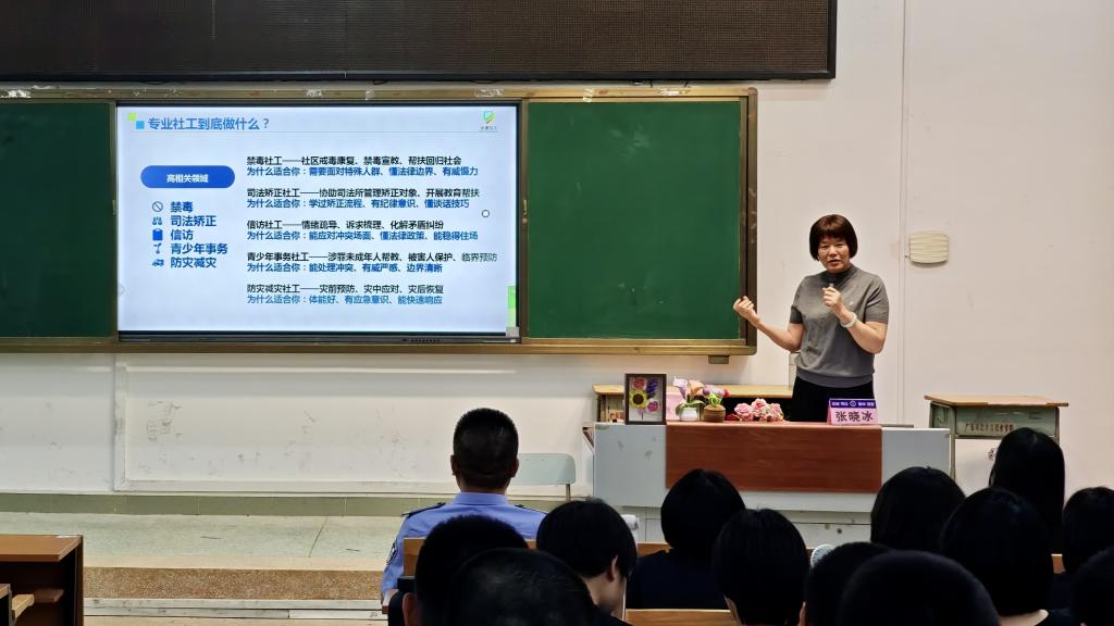 在专题讲座上,张晓冰教授围绕“警校生社工职业化路径”展开,结合中共中央办公厅、国务院办公厅《关于推进社会工作专业人员队伍建设的意见》等文件要求,立足警校生责任意识鲜明、服务意识突出、执行能力强的优势,梳理行业趋势、剖析职业瓶颈,指明职业发展方向,同时介绍大德社工的发展成果与培养体系,为学生提供就业参考。