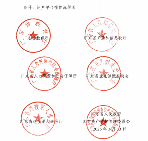 广东省教育厅、广东省工业和信息化厅、广东省人力资源和社会保障厅、广东省卫生健康委员会、广东省退役军人事务厅、广东省人民政府国有资产监督管理委员会。