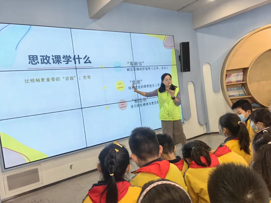 课堂上,唐英老师以警校教师的职业视角,向小学生们生动讲述了司法警官院校学子严谨刻苦的学习训练生活,诠释了纪律、担当与奉献的精神内涵。她巧妙运用“导航仪”“盾牌”“粘合剂”三个贴切比喻,深入浅出地阐释了思政课在人生导向、思想防护和价值凝聚方面的重要功能,并将宏大的价值理念转化为“遵守规则”、“诚信友善”等日常行为指引,鼓励孩子们争做守护正义、传递温暖的“小卫士”。
