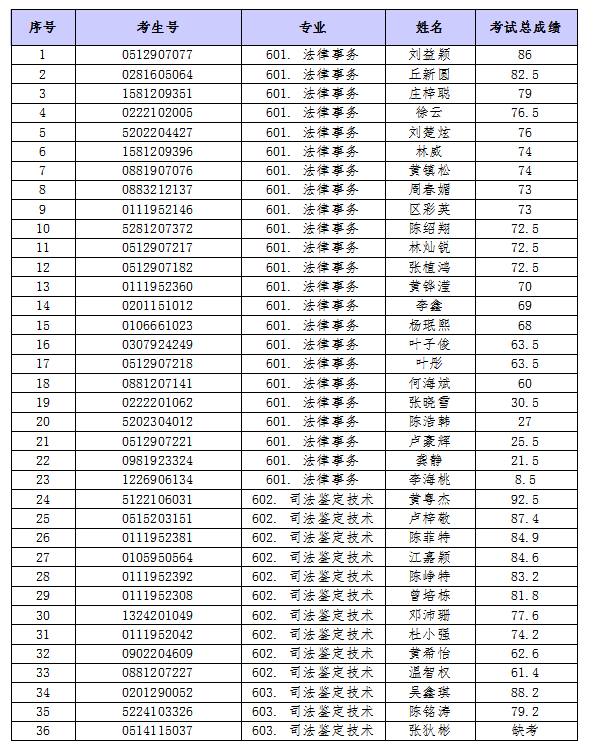 广东司法警官职业学院2023年自主招生普通现代学徒制试点考试成绩公示